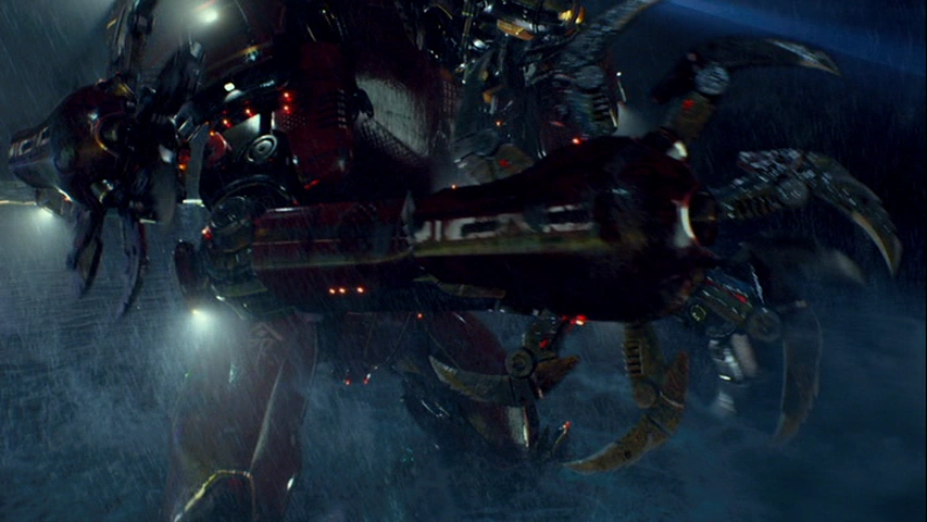 Otachi engages Crimson Typhoon first, springing out of the ocean and sweeping its barbed tail into the Jaeger's side like a flail, knocking Crimson Typhoon off balance and sending the Jaeger flying. After recovering, the triplets use their signature attack, the "Thundercloud Formation", and proceed to slice away at the Kaiju's head and chest.[2]