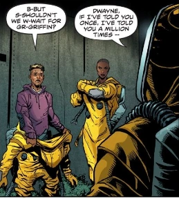 Following their arrival to the Santa Monica scrapyard, Hawk and Dwayne put on the HAZMAT suits given to them by Verma. After Joshua Griffin arrives to the scrapyard, Dwayne burns a makeshift door into the sealed wall with a weapon given to Griffin by Chris Dubango, and Hawk enters the scrapyard with the rest of the team.[2]
